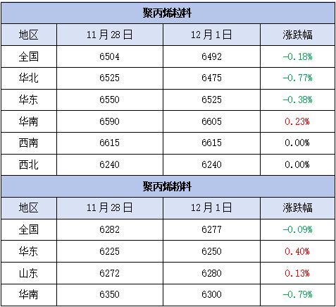 今日,聚丙烯市场盘整为主,价格小幅涨跌。PP粒料均价为6492元/吨,较上一工作日下跌12元/吨,跌幅为0.18%;PP粉料均价为6277元/吨,较上一工作日下跌6元/吨,跌幅为0.09%。美国9月原油产量创纪录,供应过剩担忧加剧,国际原油价格下跌,成本支撑减弱。在聚丙烯期货盘面偏强震荡带动下,现货市场报价小幅跟涨,但是,当前聚丙烯供需格局偏弱态势暂无实质性改善,持续压制价格走势,价格上涨乏力,实单商谈为主。
