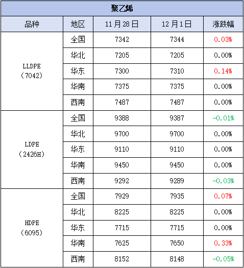 今日,聚乙烯市场窄幅整理,价格涨跌互现。LLDPE(7042)市场价格为7344元/吨,较上一工作日上涨2元/吨,涨幅为0.03%;LDPE(2426H)市场价格为9387元/吨,较上一工作日下跌1元/吨,跌幅为0.01%;HDPE(6095)市场价格为7935元/吨,较上一工作日上涨6元/吨,涨幅为0.07%。美国原油产量增加,市场担忧供应过剩,国际原油价格下跌,成本支撑减弱。聚乙烯期货盘面震荡走强,提振现货市场报价,市场报价试探性小涨。然而,聚乙烯市场需求持续疲软,成交放量有限,压制市场走势。