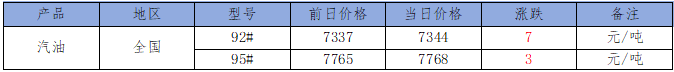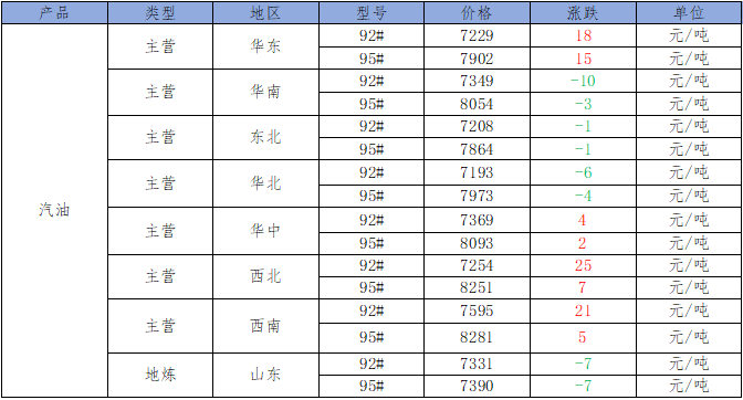 预计下个工作日主营汽油价格略有探涨;地炼汽油价格小幅上行。